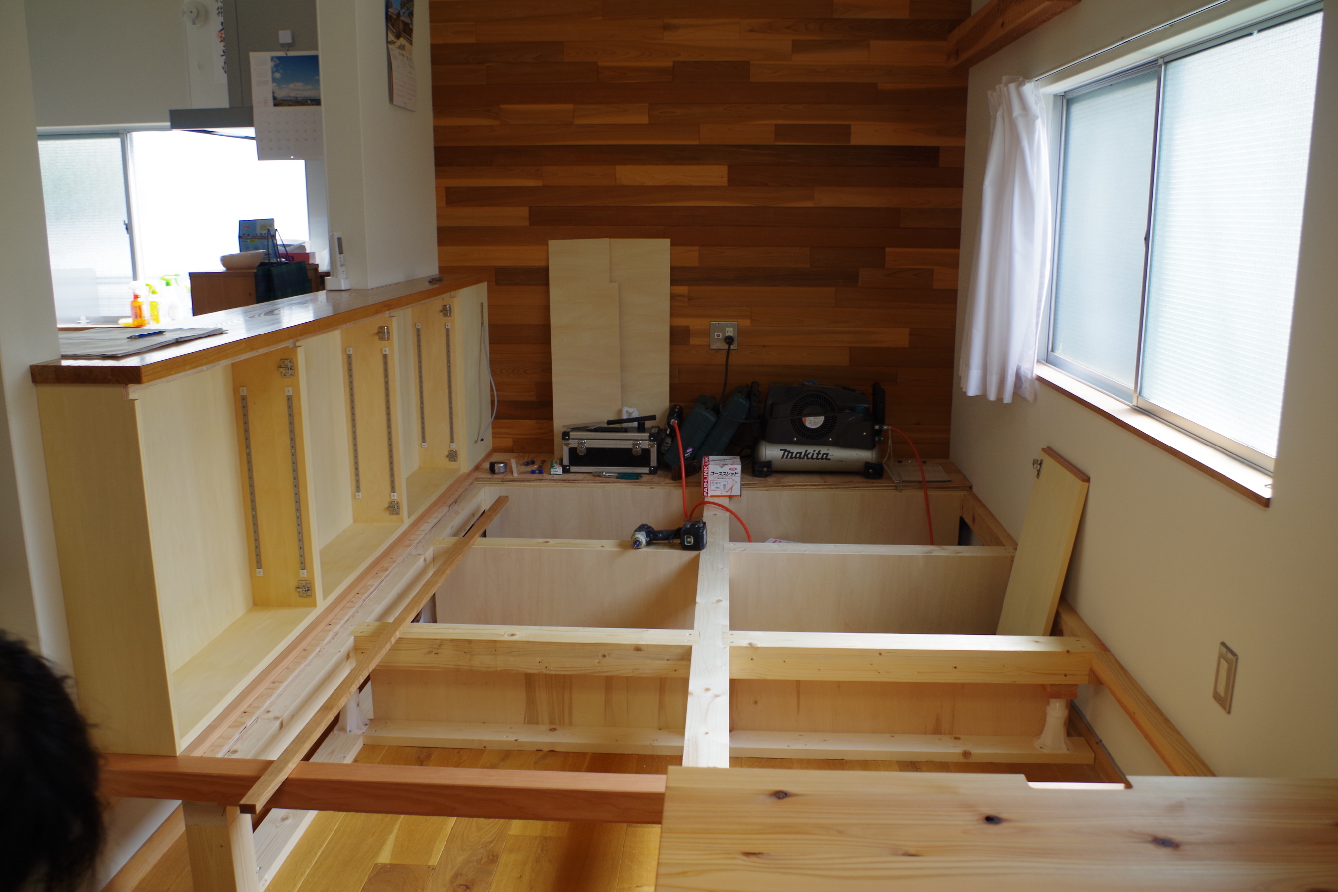 リビングは大工工事で床を上げ、キッチンカウンター下は家具工事で収納を取り付け。